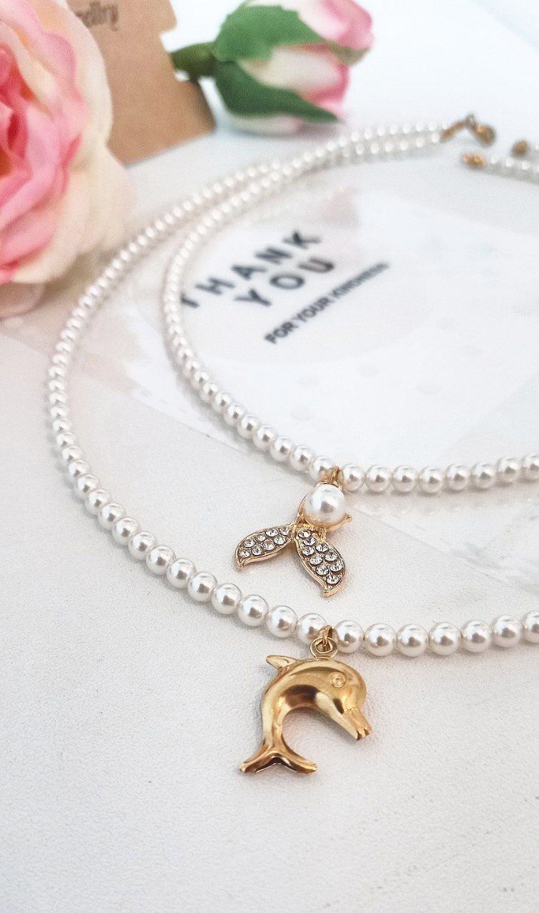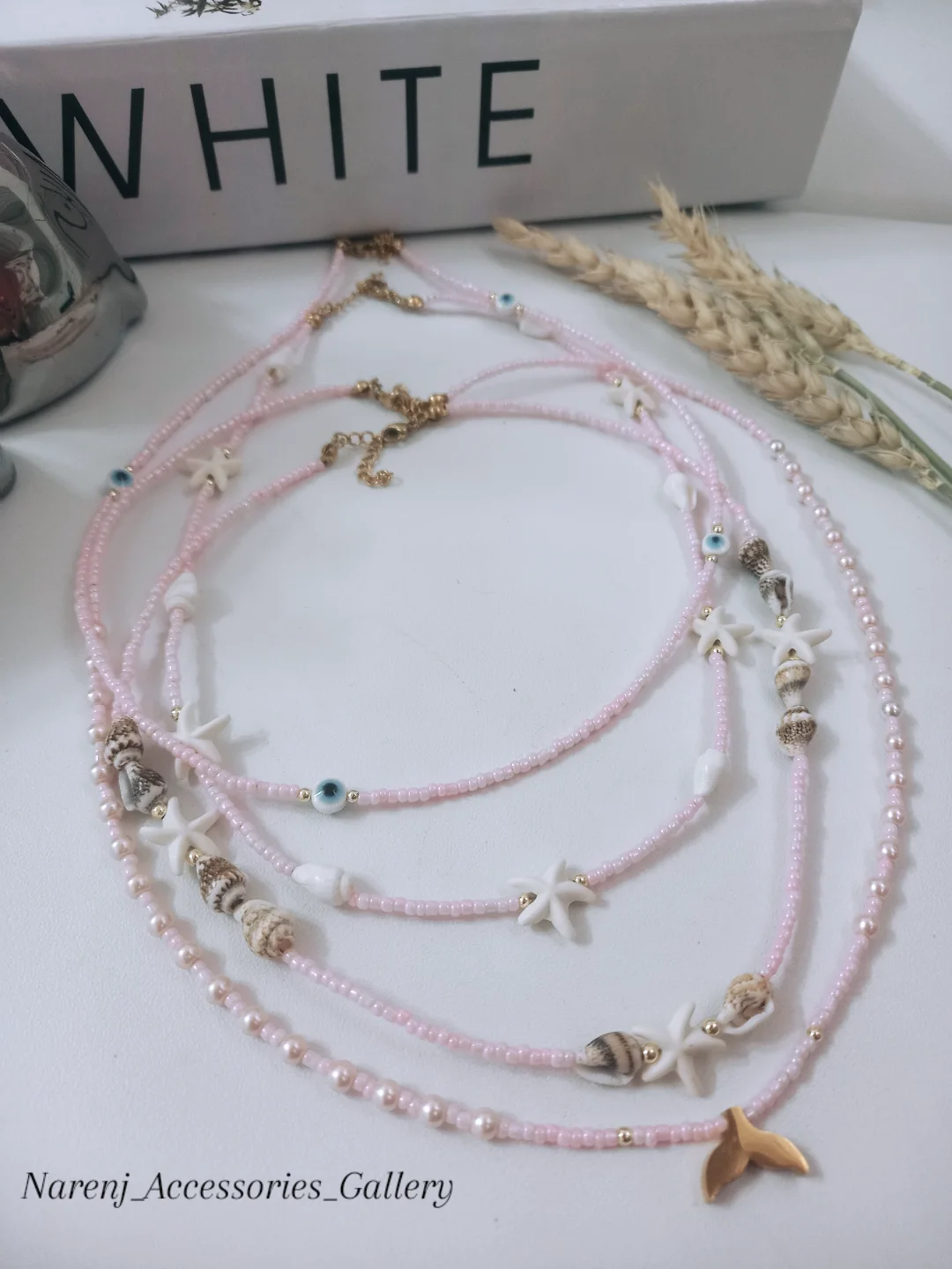 گردنبند دخترانه ساحلی صدف طبیعی و مروارید دم وال استیل
