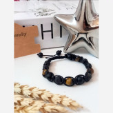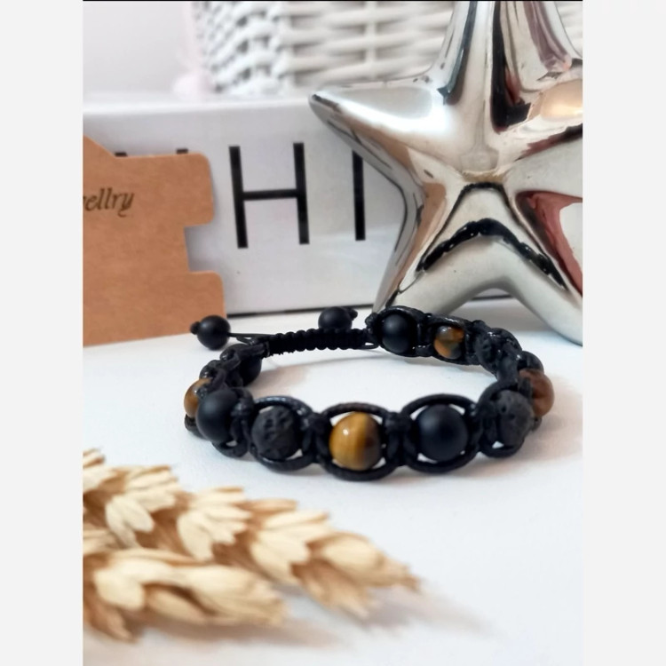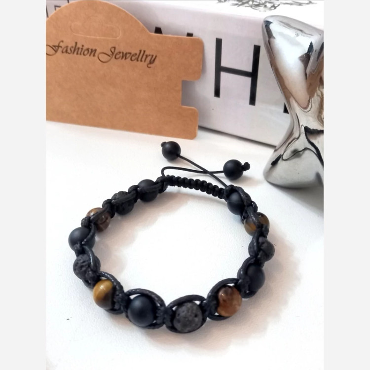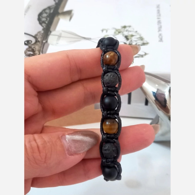 دستبند مردانه سنگ طبیعی چشم ببر، اونیکس و لاوا بافت مکرومه نوار چرمی