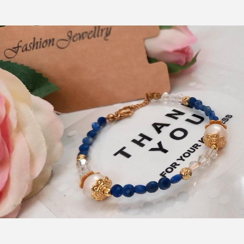 دستبند زیبای سنگ طبیعی لاجورد و مروارید پرورشی طبیعی استیل رنگ ثابت