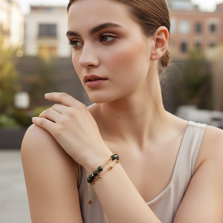 دستبند زنانه و دخترانه سنگ معدنی و طبیعی یشم کانادایی باکیفیت درجه یک سایز سنگ 8میلی درست در دولاین طراحی شده و بهم متصل هستش میتونید جدا جدا هم سفارش بدین کافی با پیام هماهنگ کنید گردنبند و گوشواره هم قابل سفارشه متریال استیل و رنگ ثابته بدون حساسیت جزئیات طلایی بین سنگ ها سنگ حدید هستش و ترکیب کمی از سنگ صدف برای زیبایی دوچندان به طراحی منحصربهفرد این دستبنده
