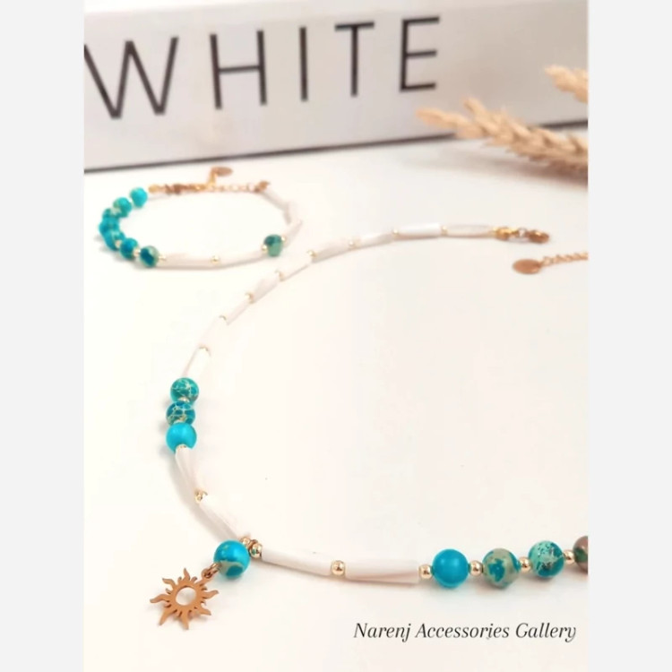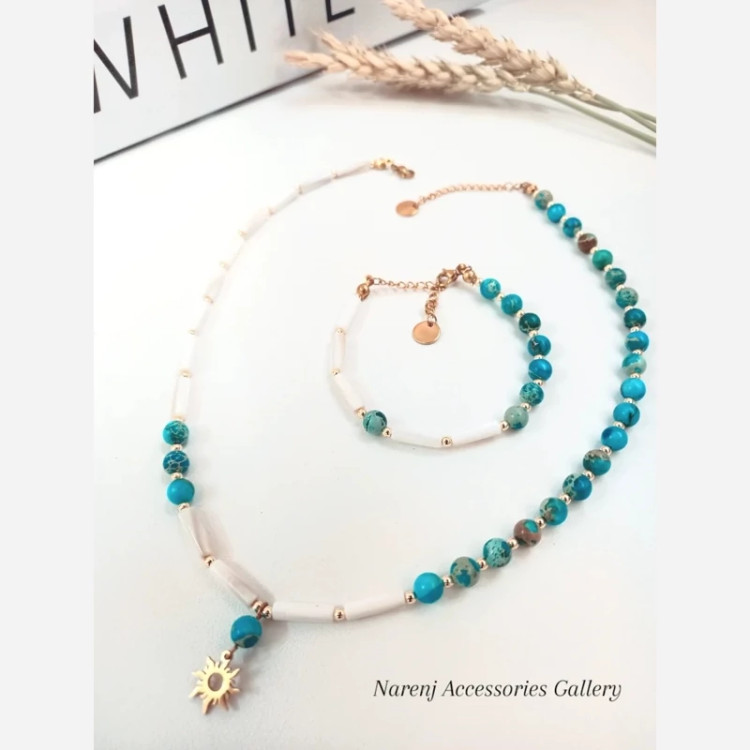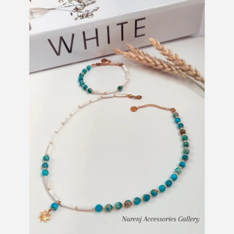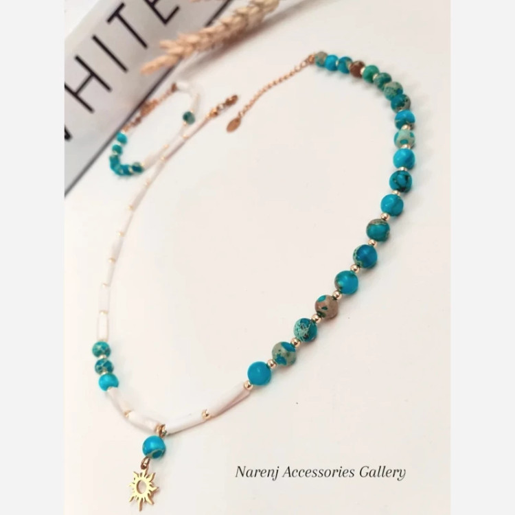 گردنبند زنانه سنگ طبیعی فیروزه و سنگ صدف