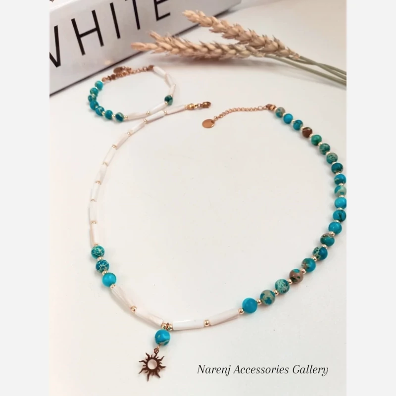 گردنبند زنانه سنگ طبیعی فیروزه و سنگ صدف