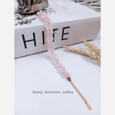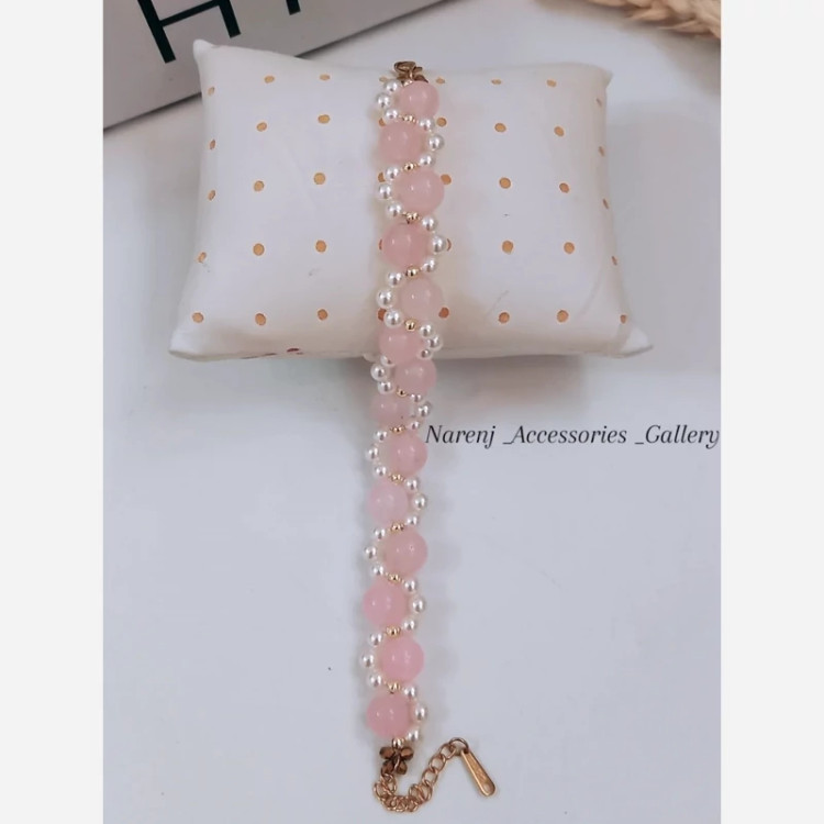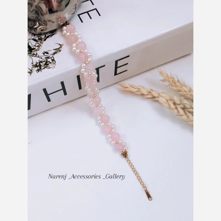 دستبند کوارتز صورتی و مروارید شل با جزئیات سنگ حدید طلایی