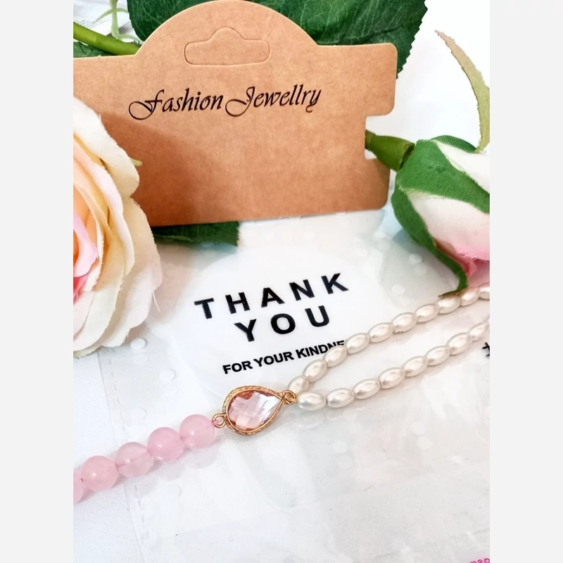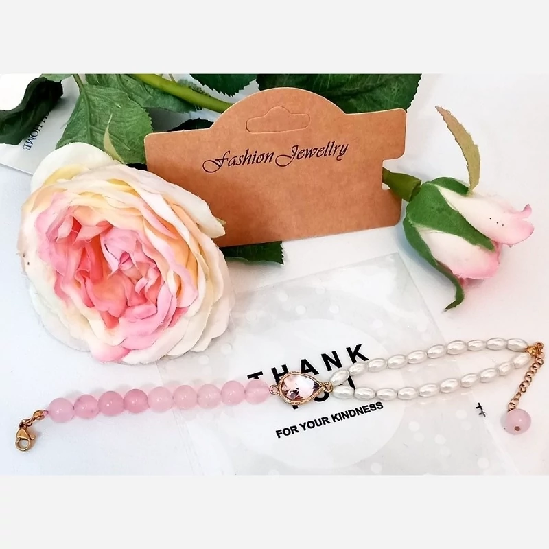 دستبند سنگ طبیعی کوارتز صورتی و مروارید