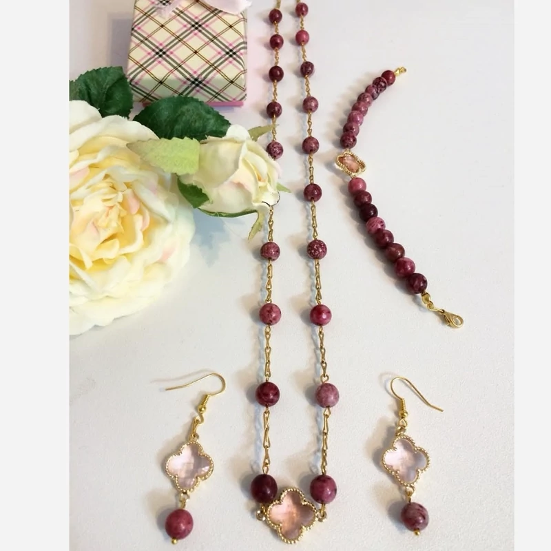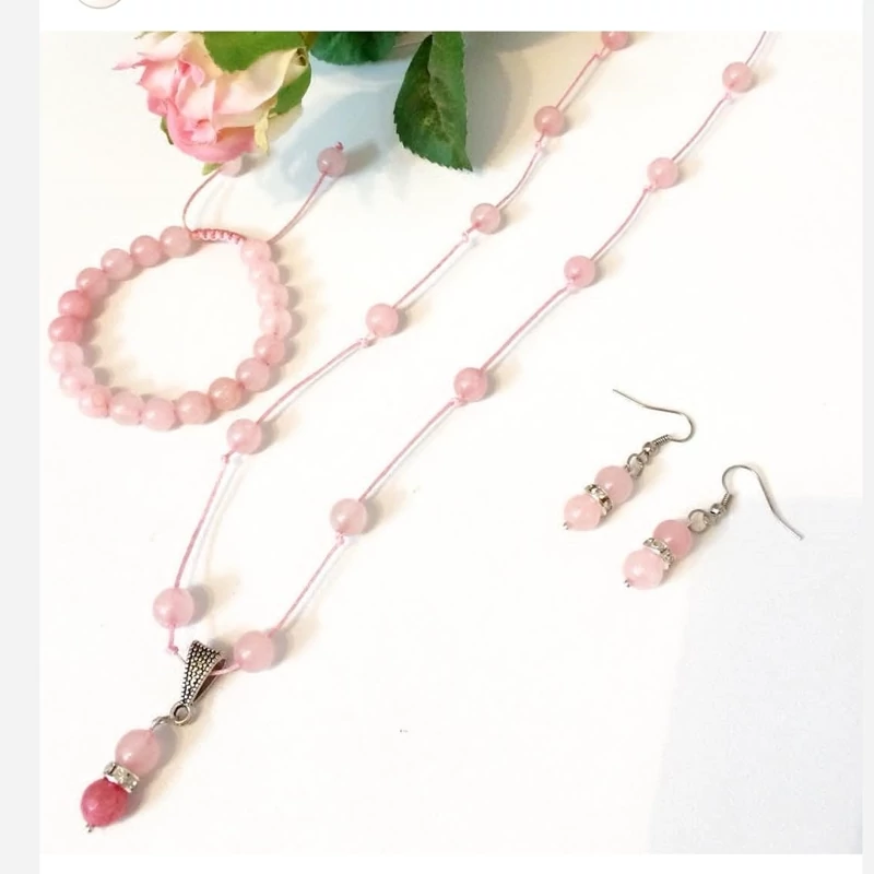 ست اکسسوری گردنبد و گوشواره و دستبند سنگ اصل کوارتز صورتی