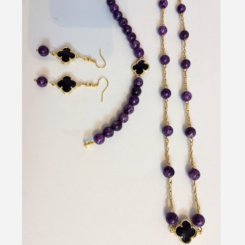 ست گردنبند گوشواره و دستبند سنگ معدنی آمیتیسیت اصل استیل و ضدحساسیت باضمانت رنگ ثابت