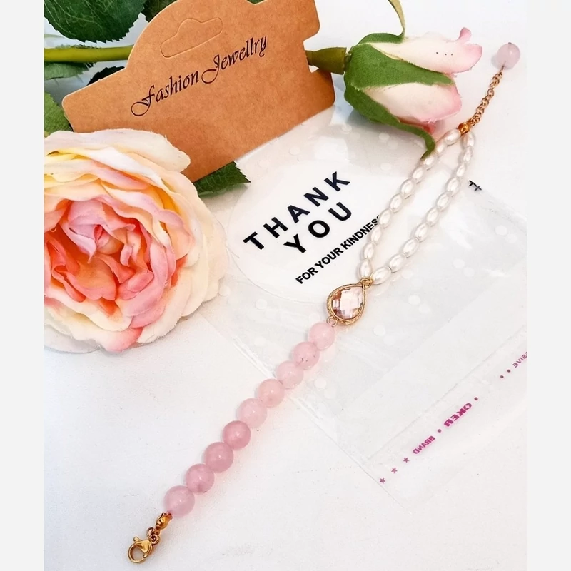 دستبند سنگ طبیعی کوارتز صورتی و مروارید